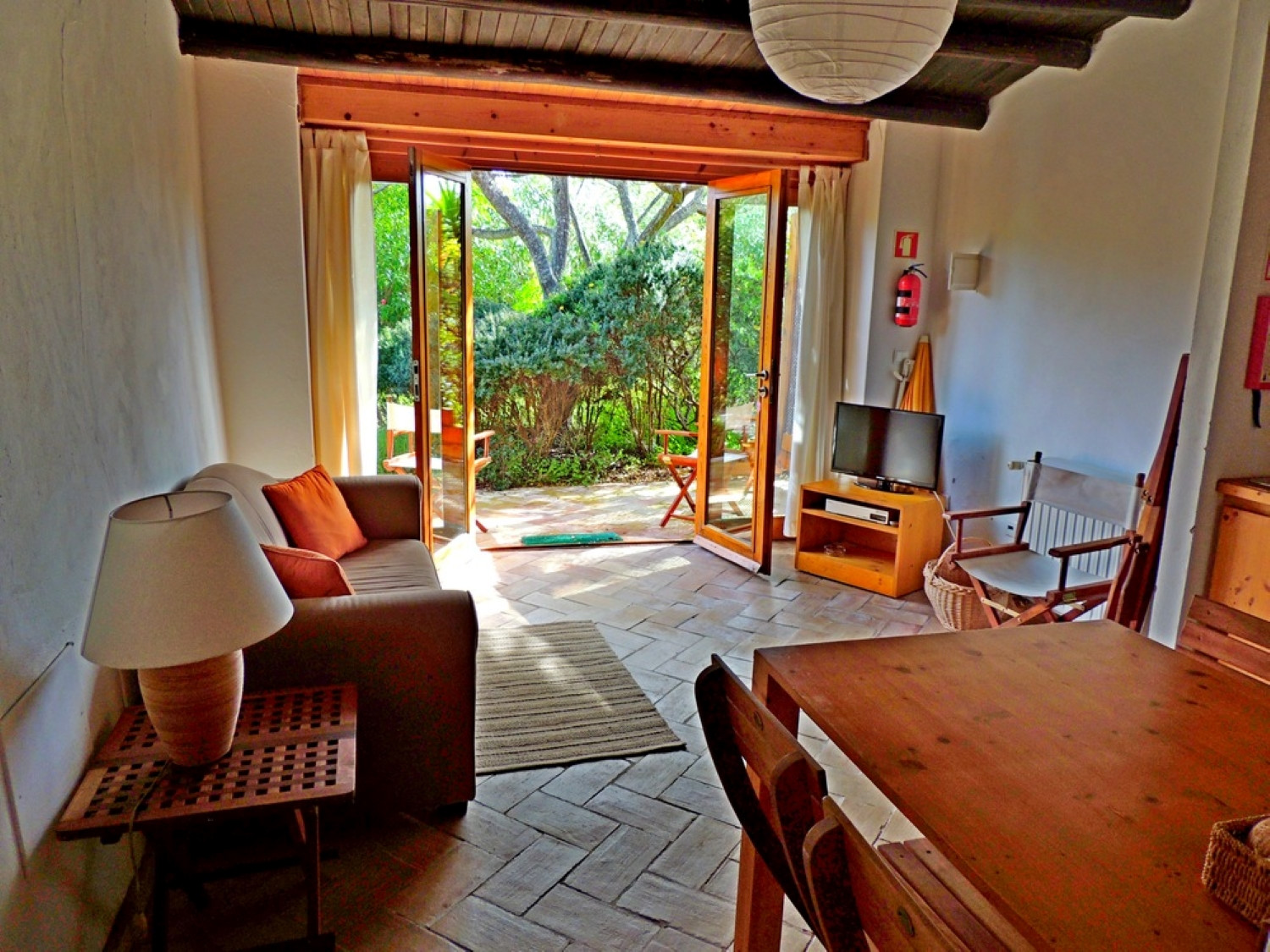 O Apartamento 2 é o mais pequeno dos apartamentos, com a zona de dormir separada da zona de estar/cozinha por uma parede de meia altura. O apartamento tem um terraço privado, mobiliário de jardim, guarda-sol e uma vista maravilhosa para a paisagem. Confortável, luminoso, acolhedor e minimalista, decorado com materiais em grande parte naturais, como madeira e algodão, foi criada uma alternativa cujo centro é a natureza. Por isso, num espaço separado, acessível pelo exterior, encontram-se o micro-ondas e a máquina de lavar roupa comuns. Da mesma forma, a zona de churrasco coberta, com vários churrasqueiras de alvenaria, mesas e cadeiras, é frequentemente utilizada para socializar e terminar o dia com vista para o maravilhoso jardim e a paisagem.