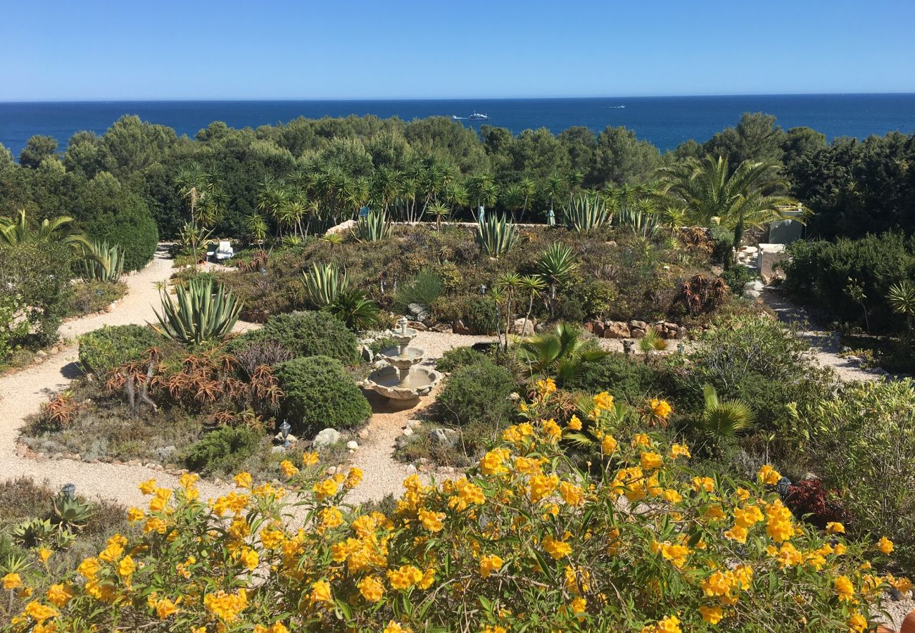 Um caminho rural leva do jardim através de um terreno coberto por arbustos, árvores, flores e arbustos nativos até à enseada balnear Praia das Fontainhas,