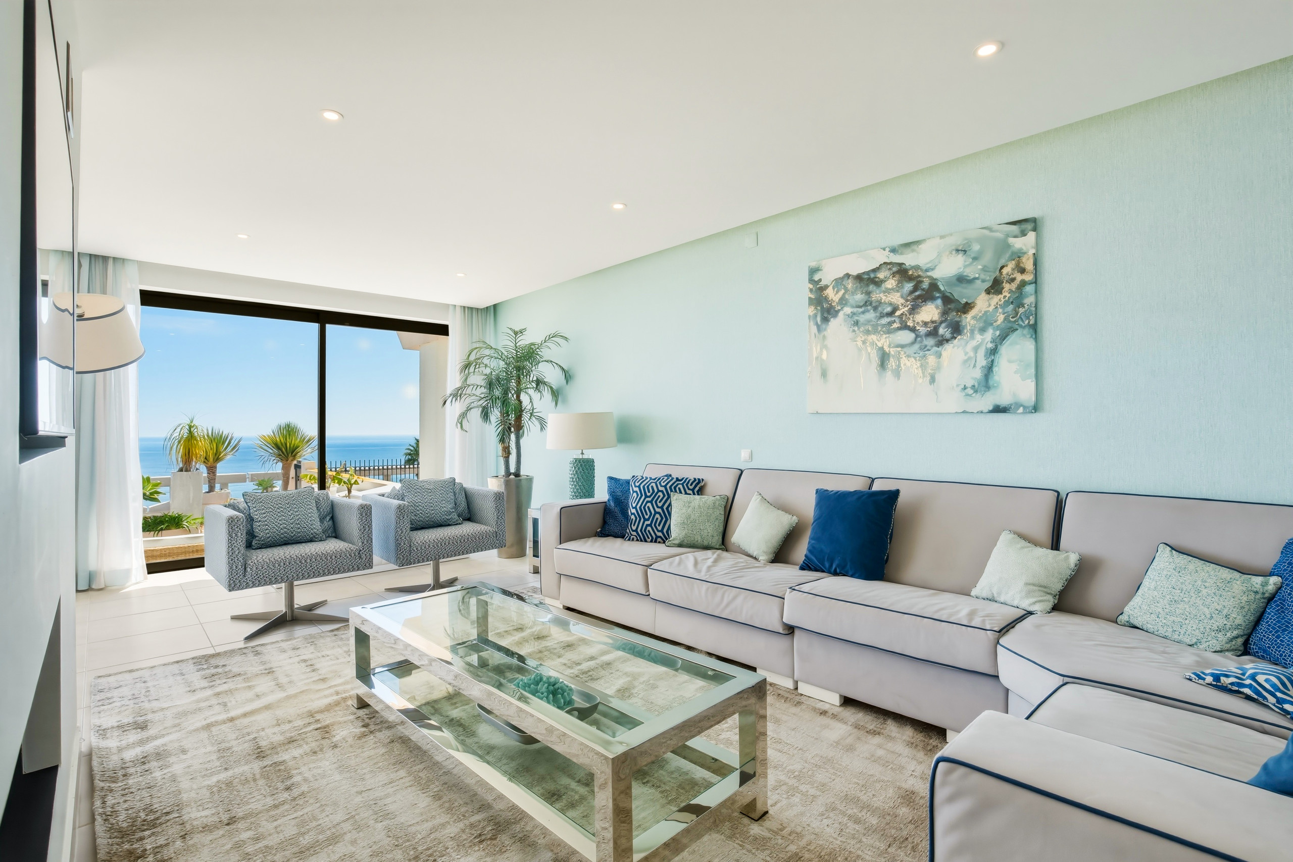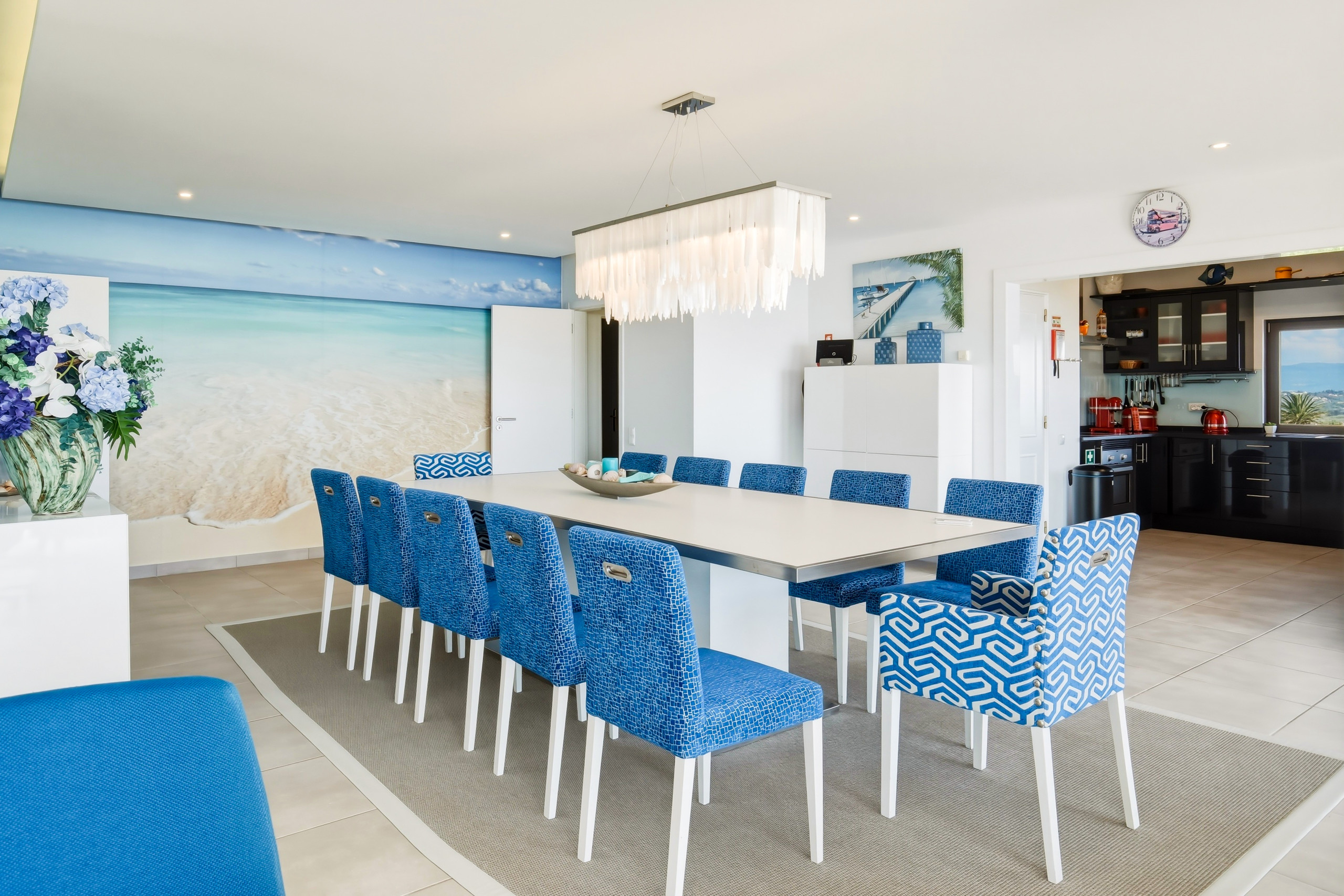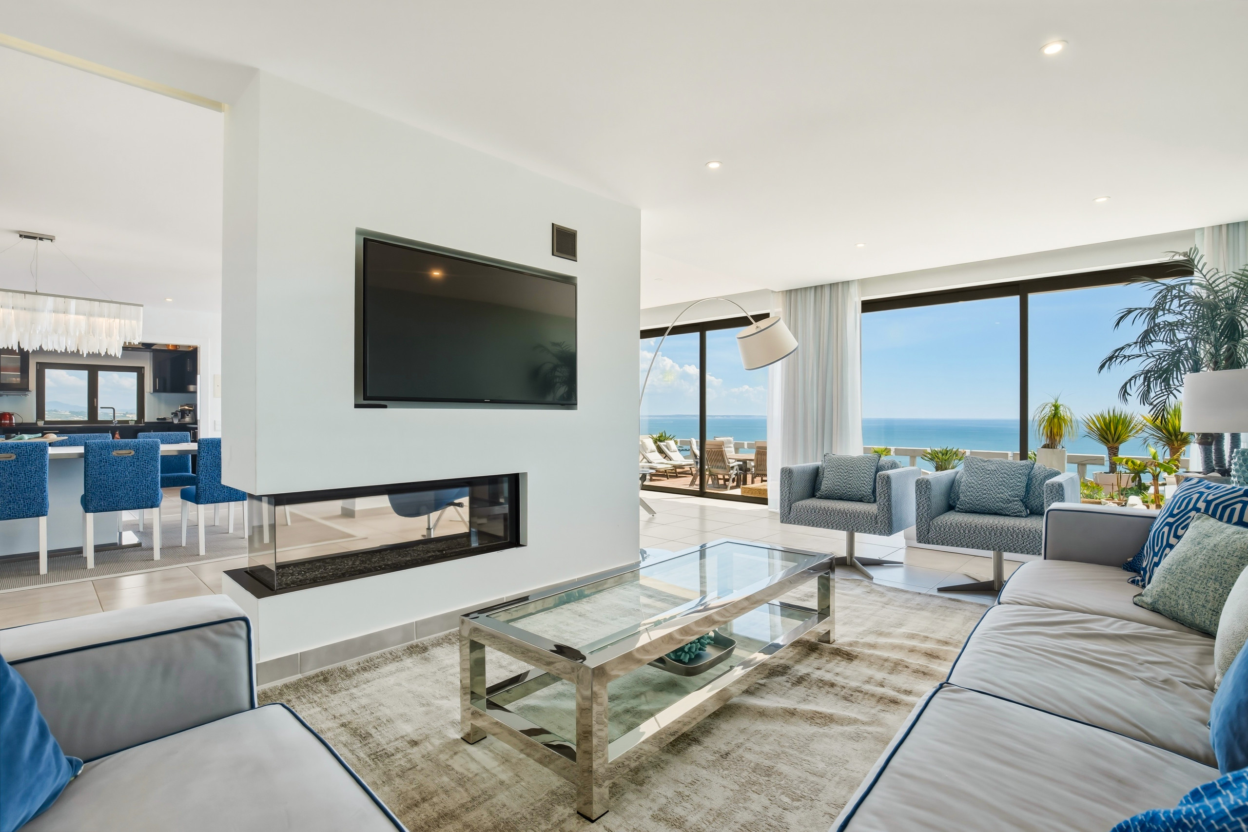 Die Ausstattung ist hochwertig, die Wohnung wurde völlig neu mit besten Materialien gestaltet. Die moderne high class Möblierung in Aqua Farbtönen, die den Wohnbereich beinahe mit dem Meer verschmelzen lassen, ist atemberaubend. Es stehen Chaiselongue, Laptop-schreibtisch, riesiger Esstisch, bequeme Sofaecke abgetrennt vom Essbereich durch einen modernen Gas-Kamin mit 2 eingebauten WLAN Fernsehgeräten zur Verfügung, die Musik nach Wunsch kommt aus einem Teufel WLAN Gerät, der Innenraum Jacuzzi in einer separaten aber offenen Nische sorgt für ein Erlebnis der besonderen Art.